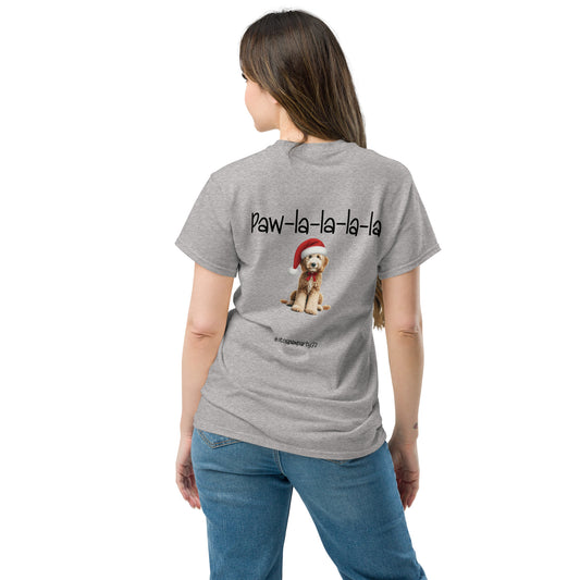 Men's Christmas T-shirt w/ black paw logo and "Pawlalalala" tag and dog on back (available in 2 colors)