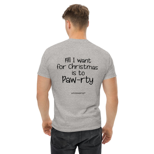Men's Christmas T-shirt w/ white paw logo and "All I want..." tag on back (available in 2 colors)